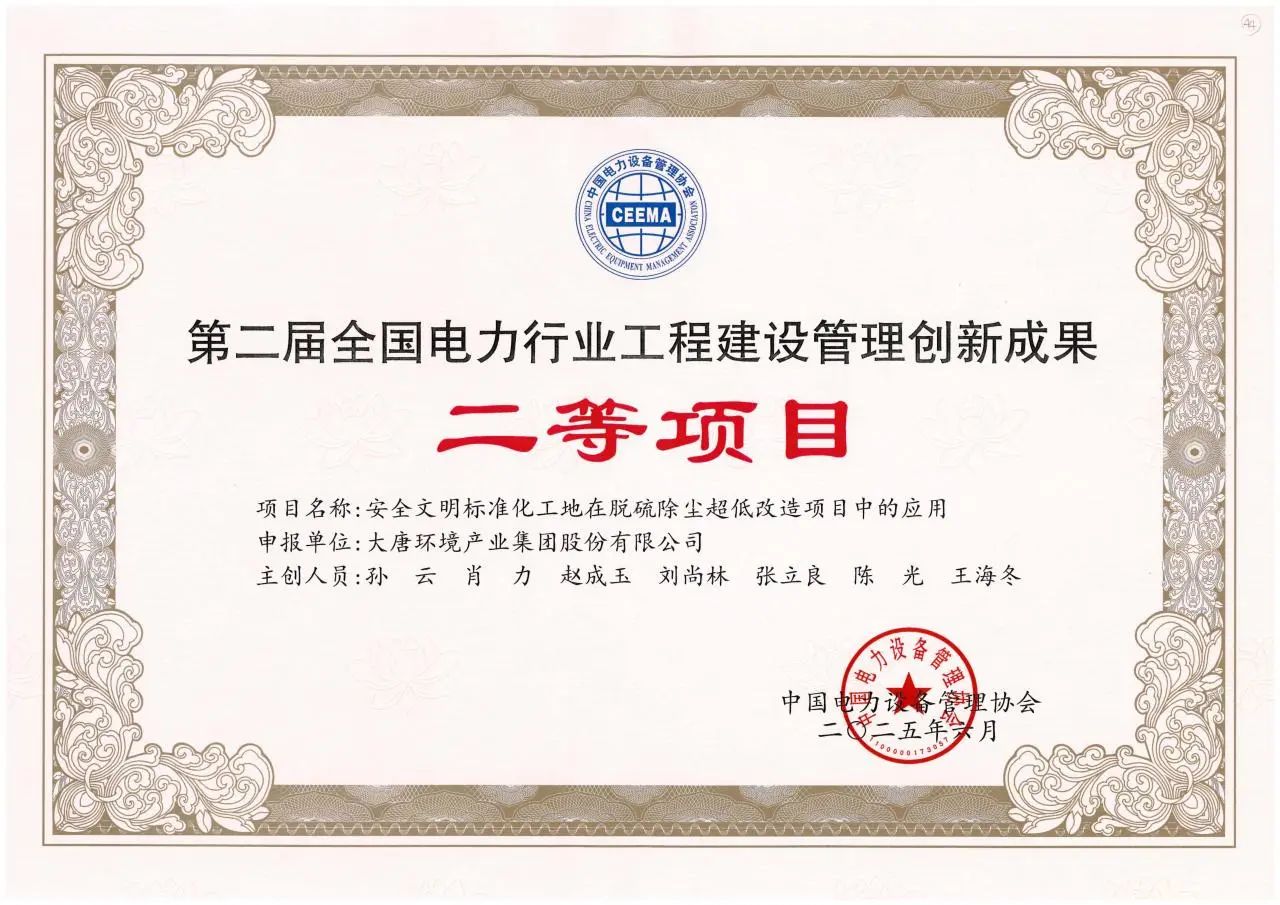 本网讯 近日,中国电力设备管理协会公布第二届全国电力行业工程建设管理创新成果评选结果。p站视频 环保分公司鸡西项目部申报的《安全文明标准化工地在脱硫除尘超低改造项目中的应用》项目,凭借其在安全管理实践中的显著成效,获二等项目奖项。
